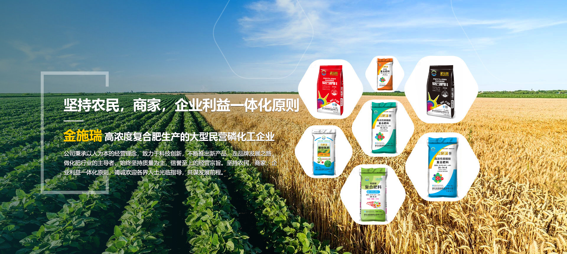 湖北金施瑞肥業有限公司是一家以生產高濃度復合肥為主導產品的大型民營磷化工企業,在湖北、河南等地均建有大型的現代化生產基地。根據各地的土壤情況不同由本公司專業的研發(fā)機構專門為各地區研制不同配方的化肥,真正做到測土配方施肥。